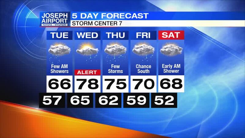 SATURDAY: Another chance for a few showers early in the day but clouds are expected to decrease. Highs will be in the upper 60s.
