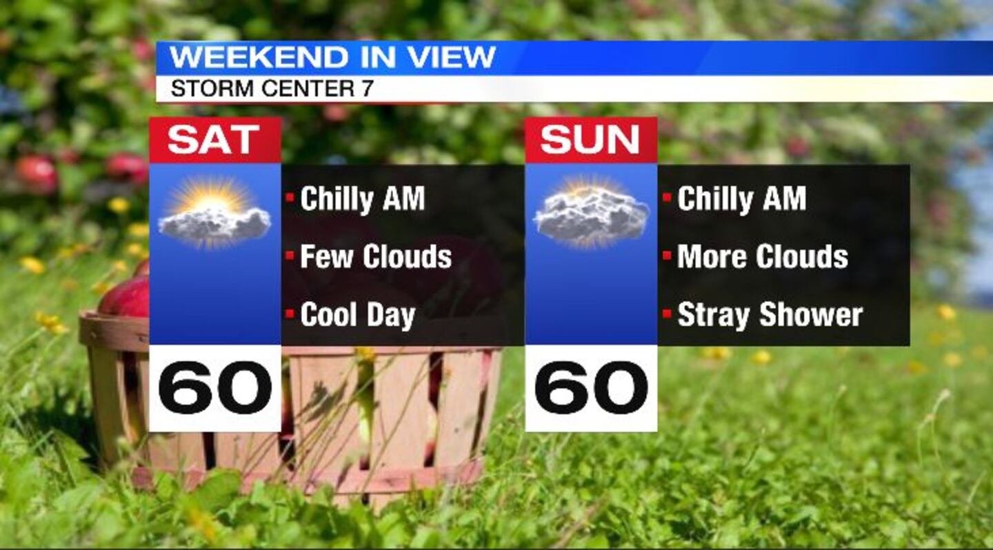 SATURDAY: Sun and a few clouds around for Saturday with cool temperatures. Highs struggling to get to the 60 degree mark. Colder overnight with lows falling to around 40 degrees with some spots in the upper 30s by Sunday morning.