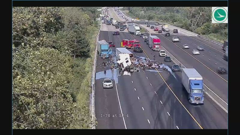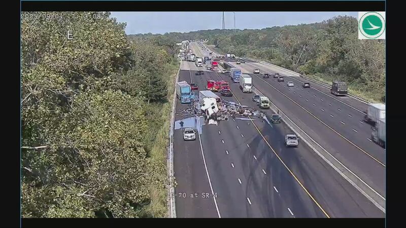 >> PHOTOS: Crash on I-70 in Clark County causes semi to lose it’s load