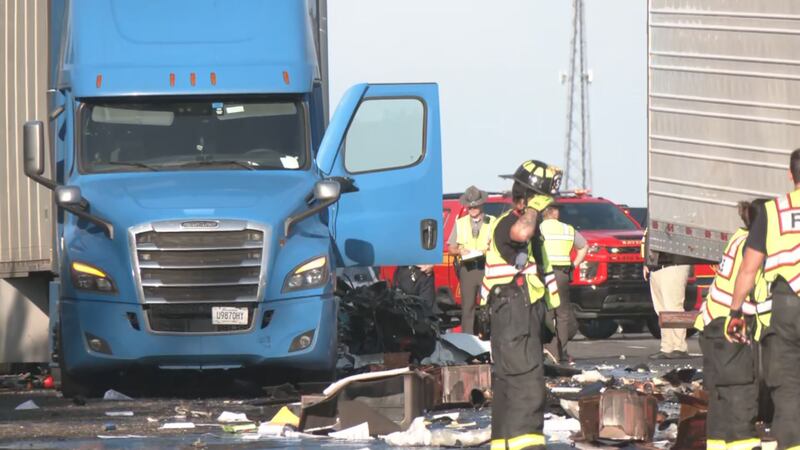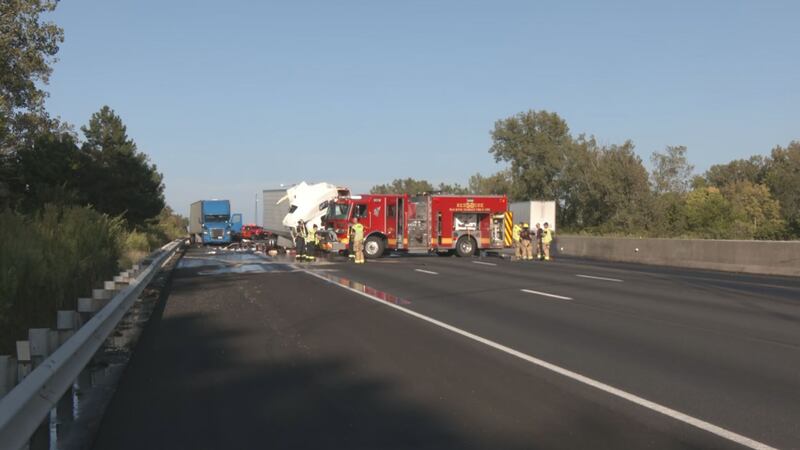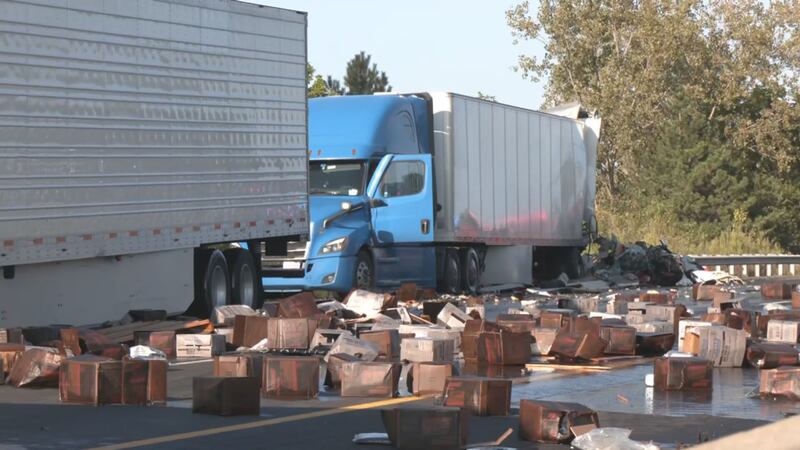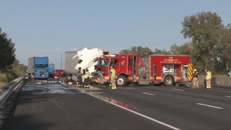 Video from News Center 7’s crew on the scene shows that one semi was jackknifed and had lost a portion of its load, which was mainly motor oil.