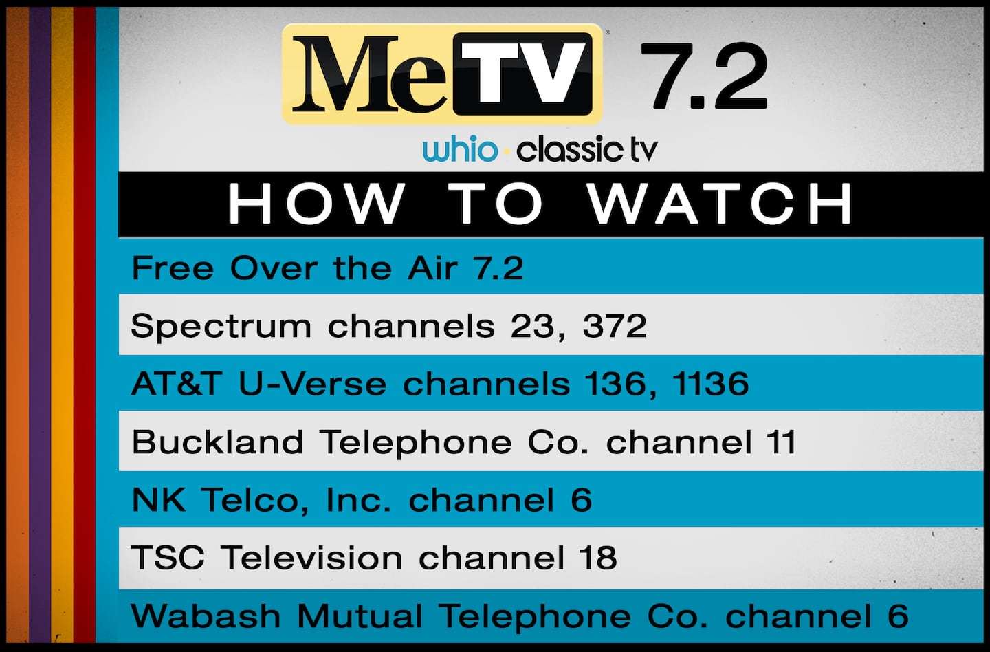 Viewers can watch the game on MeTV over the air on 7.2, Spectrum Channels 23 and 372, AT&T U-Verse channels 136 and 1136, Buckland Telephone Company Channel 11, NK Telco, Inc. channel 6, TSC Television channel 18, and Wabash Mutual Telephone Company channel 6.