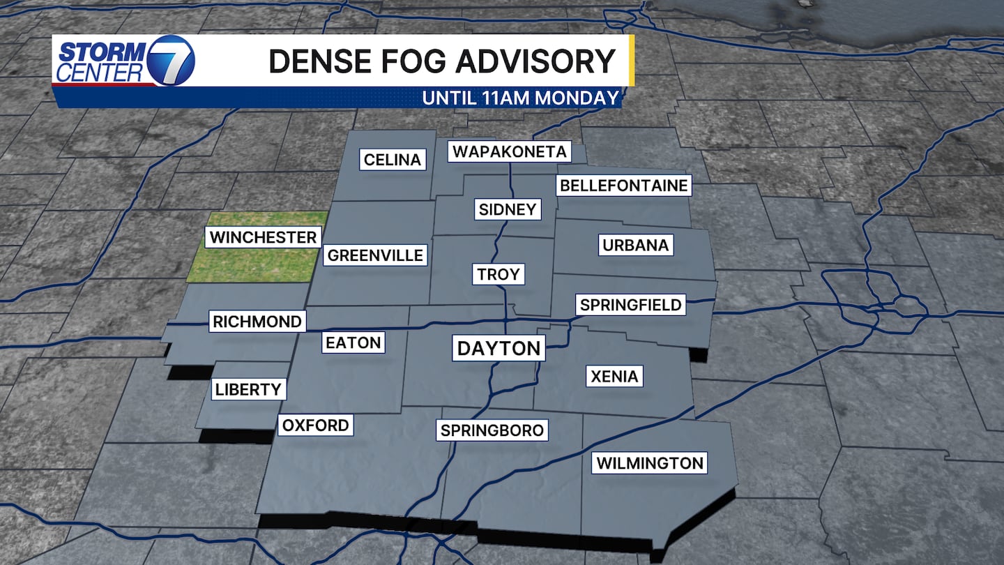 A Dense Fog Advisory is now in effect for most of the region (except Randolph County, Indiana) until 11 a.m. on Monday.