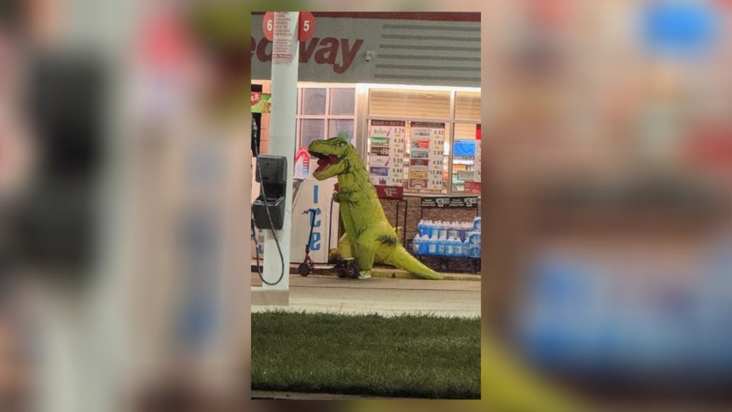 Clark County Sheriff Chris Clark confirmed that a person wearing an inflatable Dinosaur costume was spotted riding a scooter at the gas station.