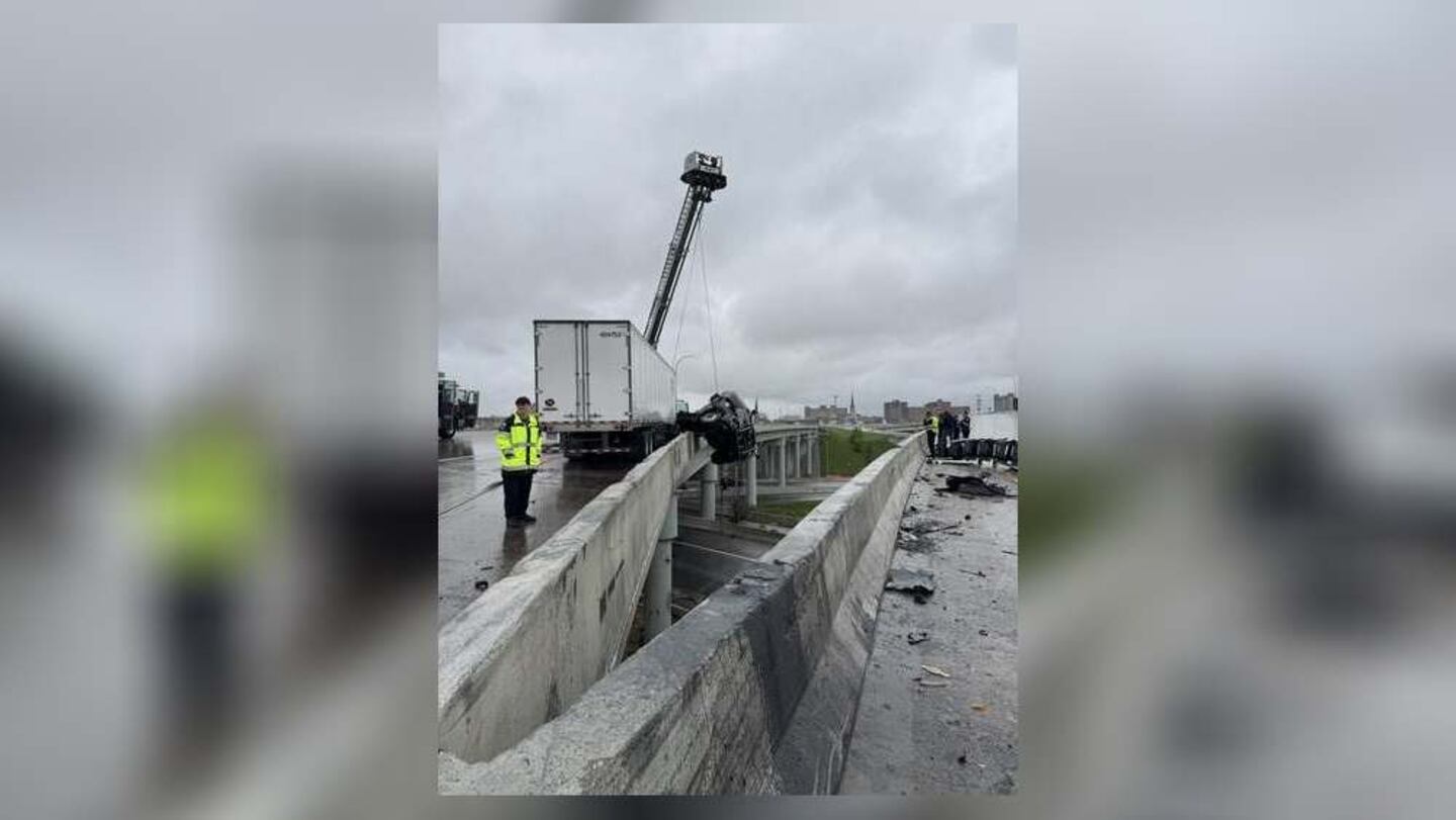 “You’ve got a precarious situation where the cab of a truck is dangling off an interstate. It could possibly separate and fall,” said Brian O’Neill, fire chief.