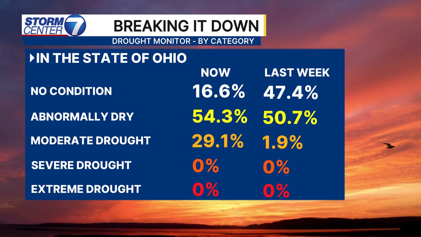 When we look at the state of Ohio, we do find some pockets of Moderate Drought not far from the Miami Valley. Last week, just 1.9% of Ohio was officially in drought. Now, that number is climbed to 29.1%, marking a big increase from last Thursday.