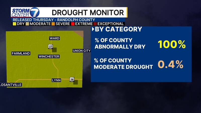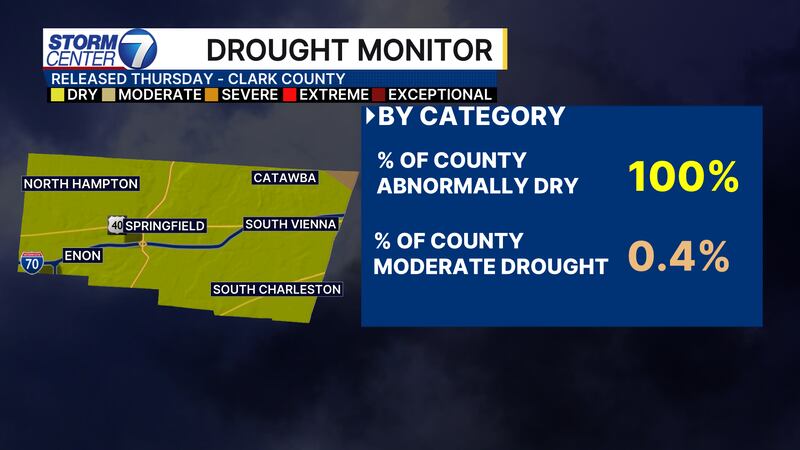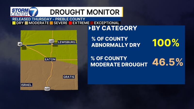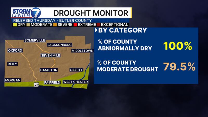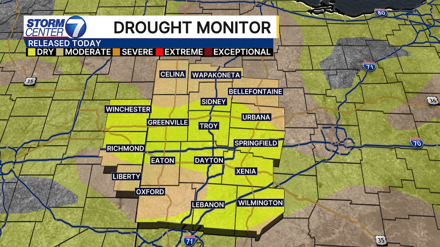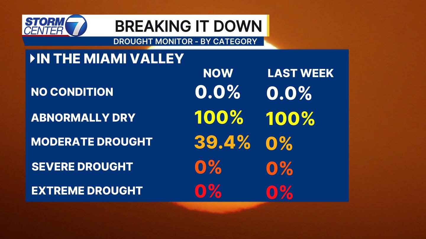 The latest update reflects some of the area being officially designated into a drought category, which as of now is classified as a “Moderate Drought.” As of this morning’s numbers specifically related to the Miami Valley, 39.43% of the area is in a drought, with still 100% of us being in abnormally dry conditions.