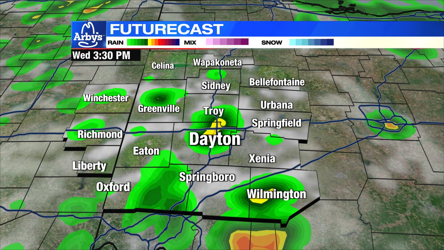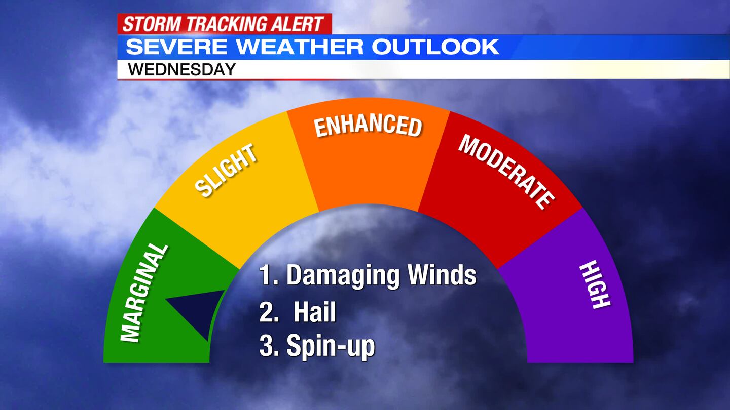 WEDNESDAY: Mostly cloudy with a few rounds of showers and thunderstorms. An isolated storm may become severe into the afternoon and evening with damaging winds the primary threat.
