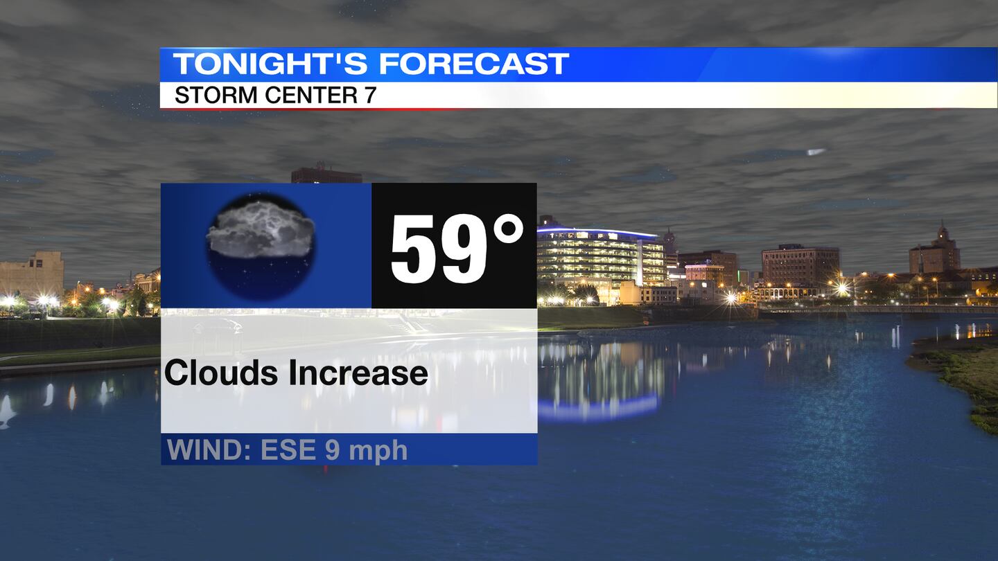 TODAY: Mainly clear and mild through the evening with temperatures falling through the 60s. Clouds increase overnight with a few showers possible by daybreak. Lows will dip to around 60 degrees.