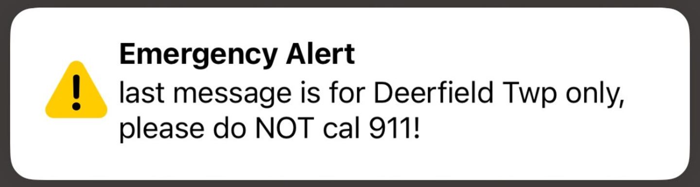 Another alert sent to News Center 7 staff in the area said, “Last message is for Deerfield Twp only, please do NOT cal(l) 911!”