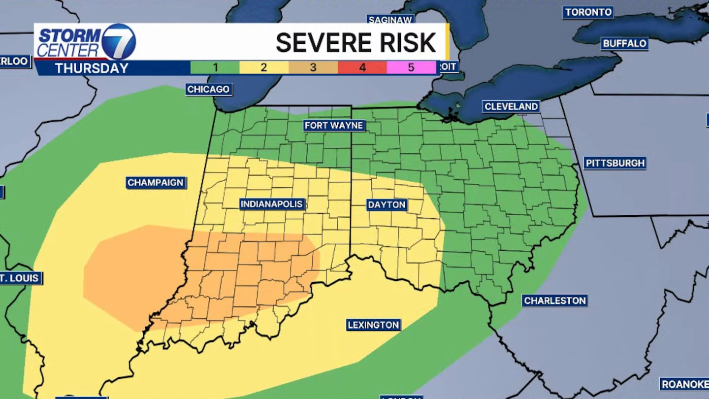 As of the early afternoon update, the Storm Prediction Center maintains a Level 2 of 5 (Slight) Risk for severe weather. The greatest severe risk is further to our southwest in southern Indiana and southeast Illinois, where a Level 3 of 5 (Enhanced) Risk stands currently.