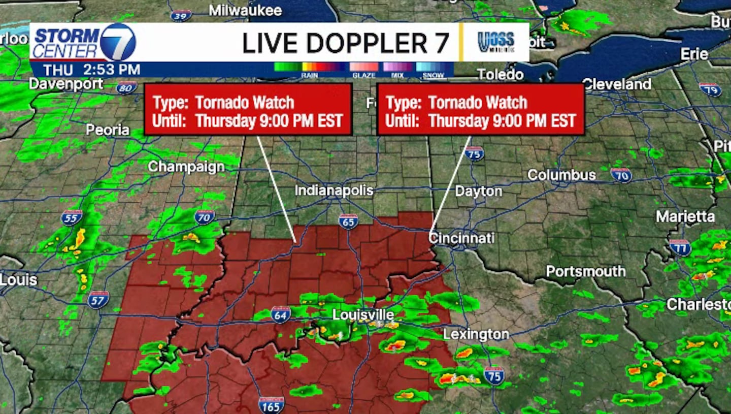 As of just before 3 PM, a Tornado Watch borders our counties to the southwest. No active alerts are in effect right now across the Miami Valley, but we should note that the tornado watch could expand northeastward with time.