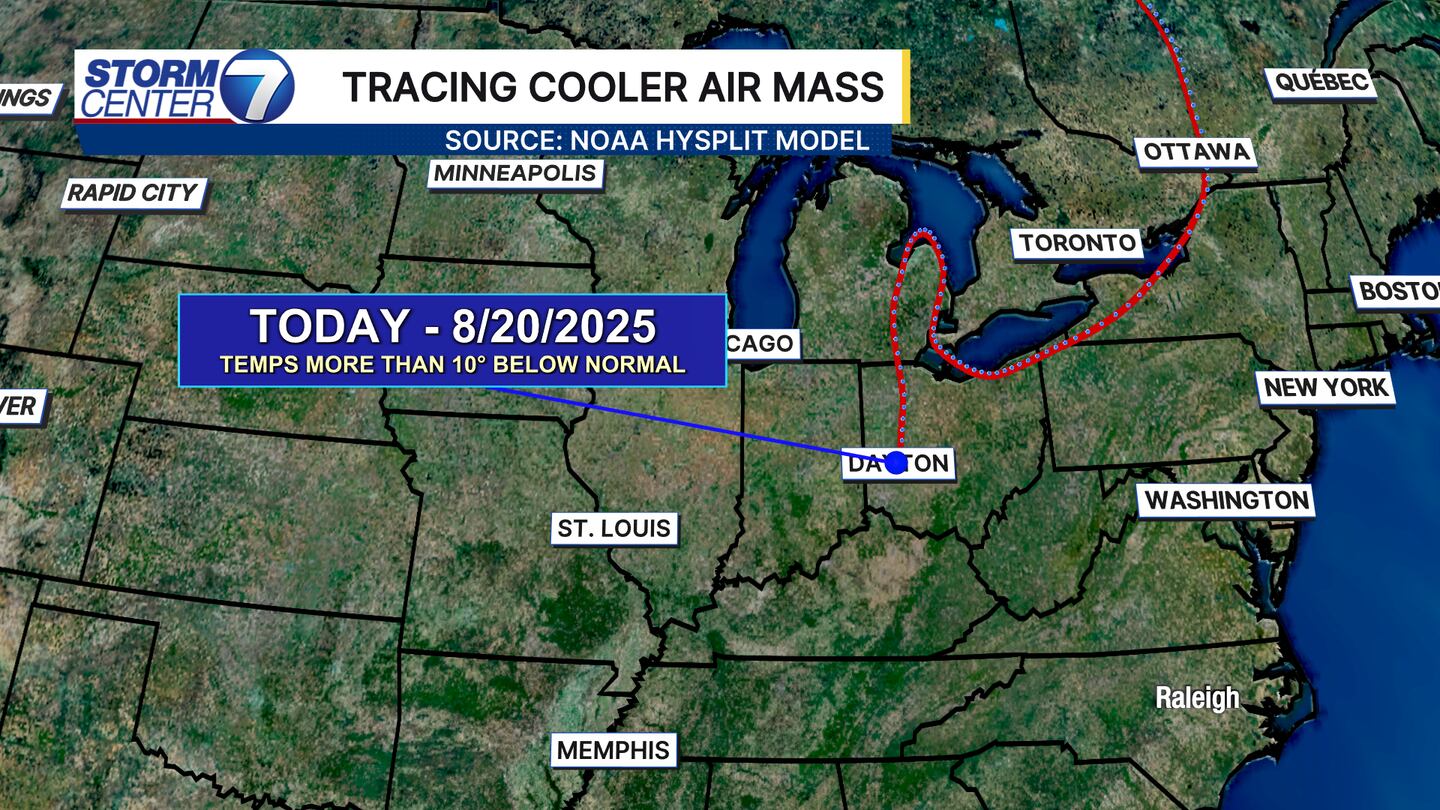 DAYTON, OH — As you step outside today, it sure does not feel like August 20th here in the Miami Valley! Temperatures are anywhere from five to more than ten degrees below normal across the Ohio Valley. In fact, one may say it feels like Fall! Today’s highs are more typical of the second half of September.
