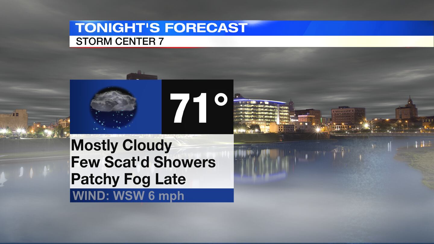 TODAY: Overnight, mostly cloudy, passing scattered showers and embedded thunderstorms, some patchy fog, warm and muggy, in the lower 70s, Storm Center 7 Meteorologist Dontae Jones said.