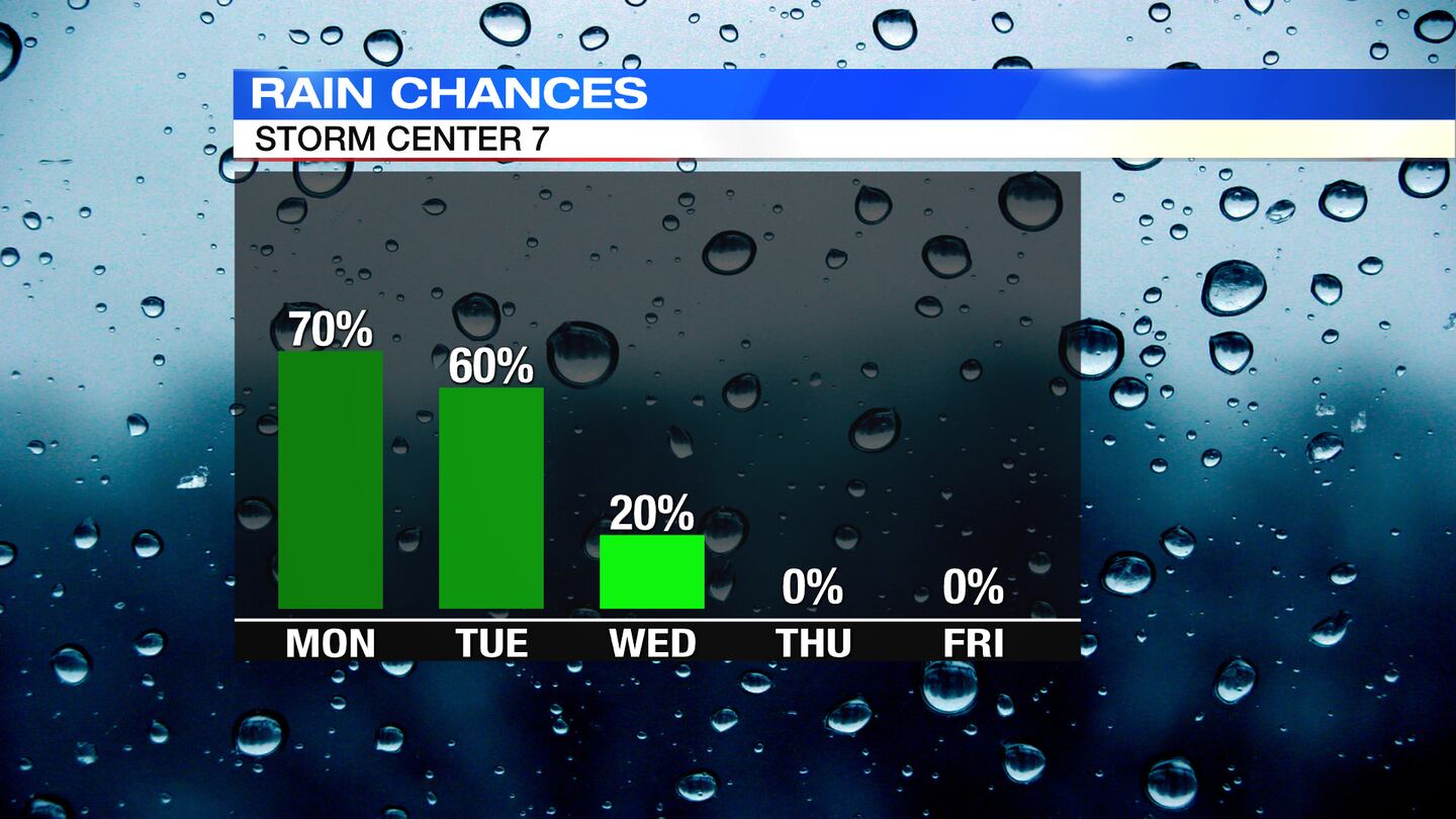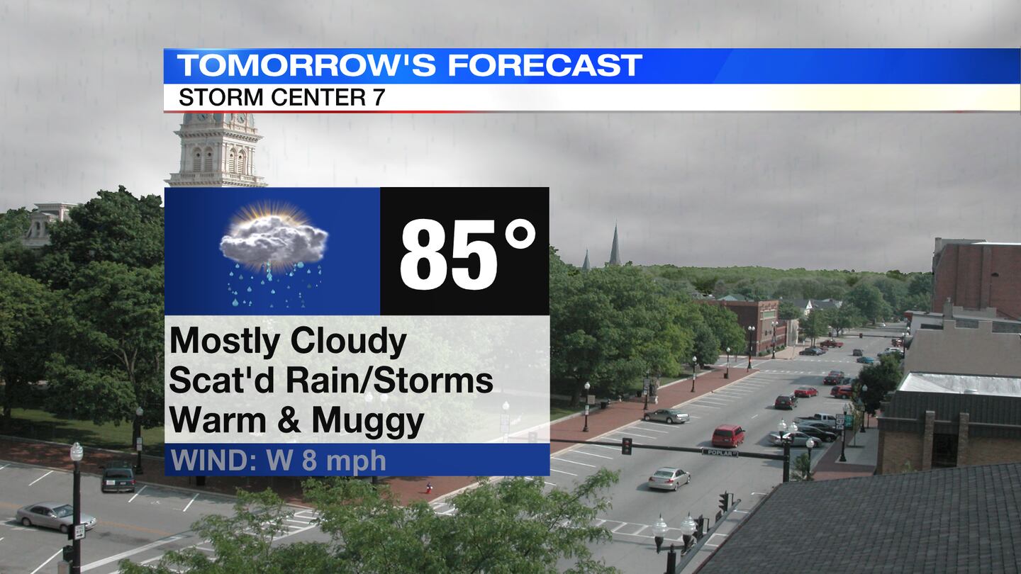 MONDAY: Mostly cloudy with a better chance for scattered showers and thunderstorms. Some of the rain that develops may be heavy. Warm and muggy with highs in the mid 80s.