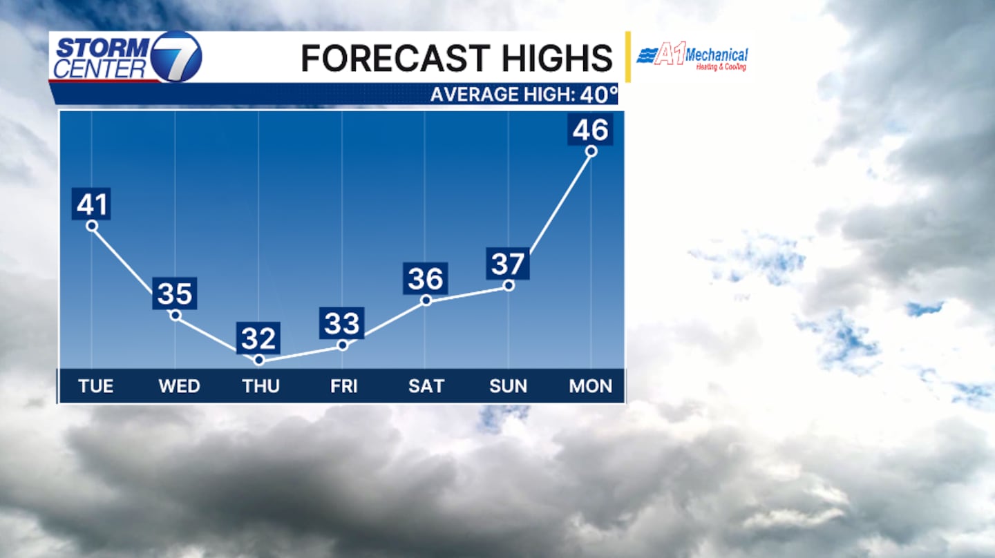 In fact, high and low temperatures are returning around “normal” over the next weeks time. Low temperatures will stay in the twenties and high temperatures holding above freezing.