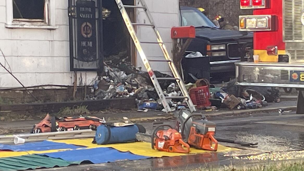 Photos from the scene show damage to the front door and first-floor windows of the house.