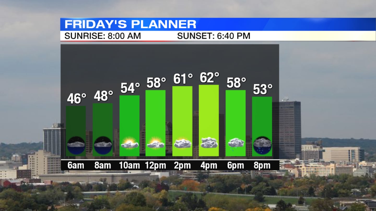 Friday: The day will start with some sunshine but clouds will increase during the afternoon. Showers will develop by early evening and continue Friday night. Temperatures will reach into the lower 60s before the rain arrives, then slowly drop.