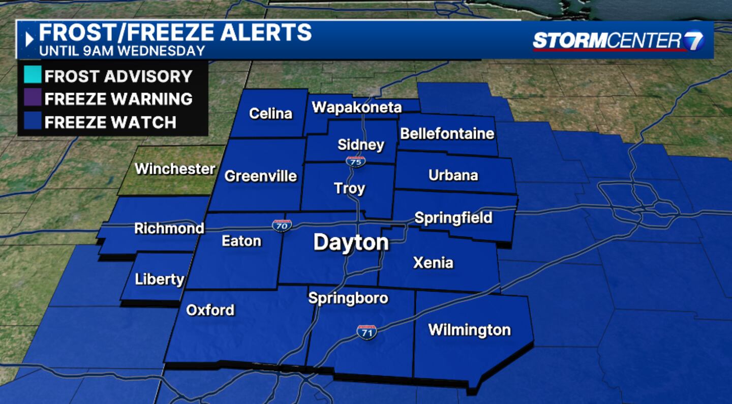 A Freeze Watch has also been issued starting Tuesday night until Wednesday morning for all but Randolph County in Indiana.