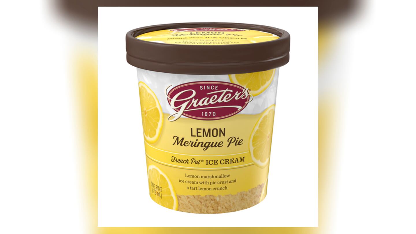 Graeter’s Lemon Meringue Pie ice cream is made with tart lemon candies, crunchy pie crust pieces, and lemon marshmallow ice cream, according to a company spokesperson.