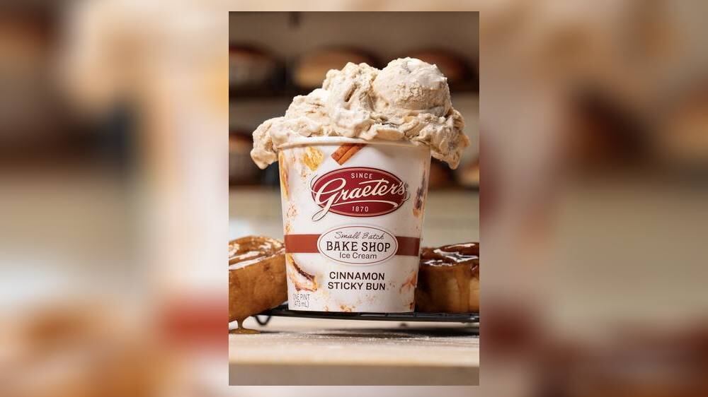 Cinnamon Sticky Bun features a cinnamon ice cream swirled with brown sugar and sticky bun dough, finished with crunchy toffee pieces.