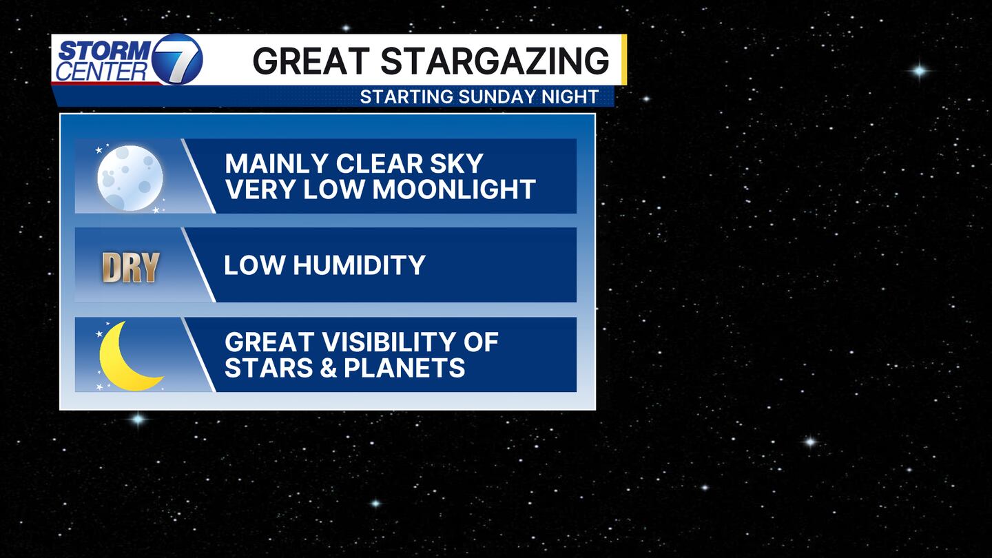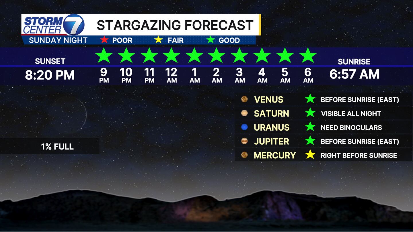 Starting Sunday night as we clear the sky from any daytime clouds, we will enter a stretch of great weather for a few nights for those who like to stargaze or check out some planets!