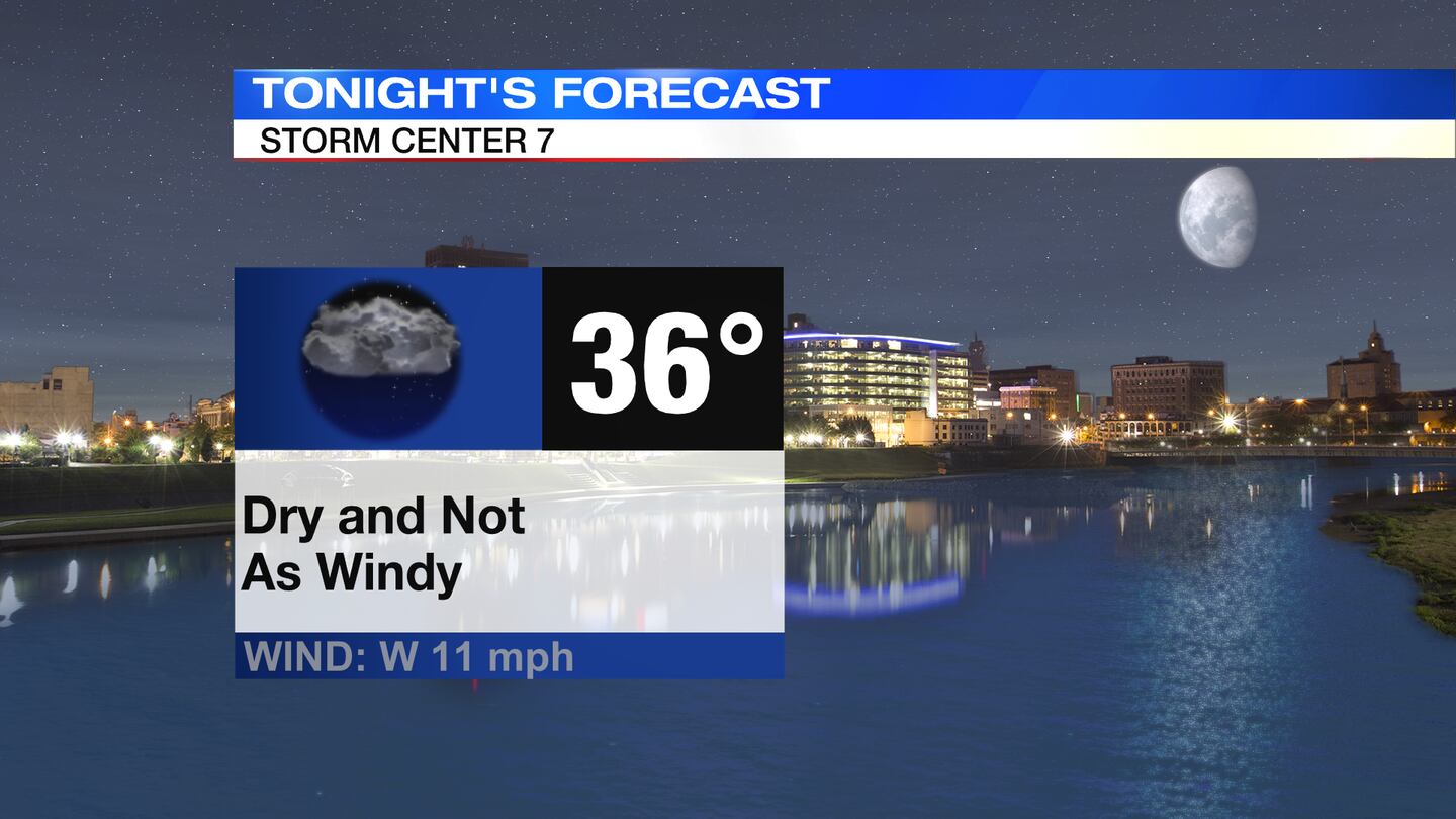 OVERNIGHT: Winds will diminish a bit overnight, but still breezy. Storm Center Chief Meteorologist McCall Vrydaghs says scattered clouds will linger through the night. Temperatures will fall to the middle 30s.