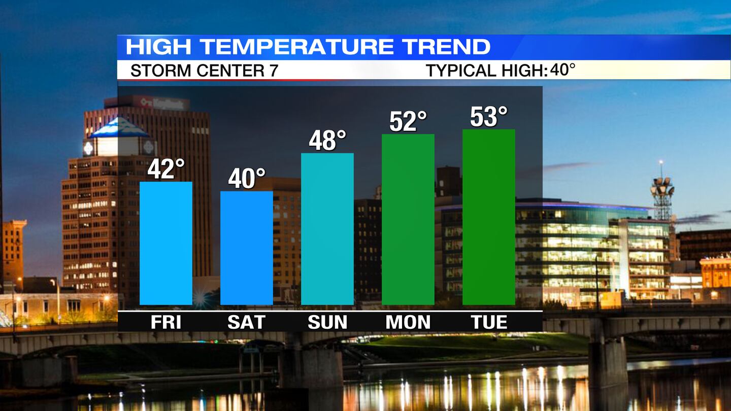 FRIDAY: A cooler day. Scattered clouds linger, then some sunshine by the end of the day. Highs in the low 40s. A little breezy but not like Thursday. Wind chills will be in the 20s and 30s.