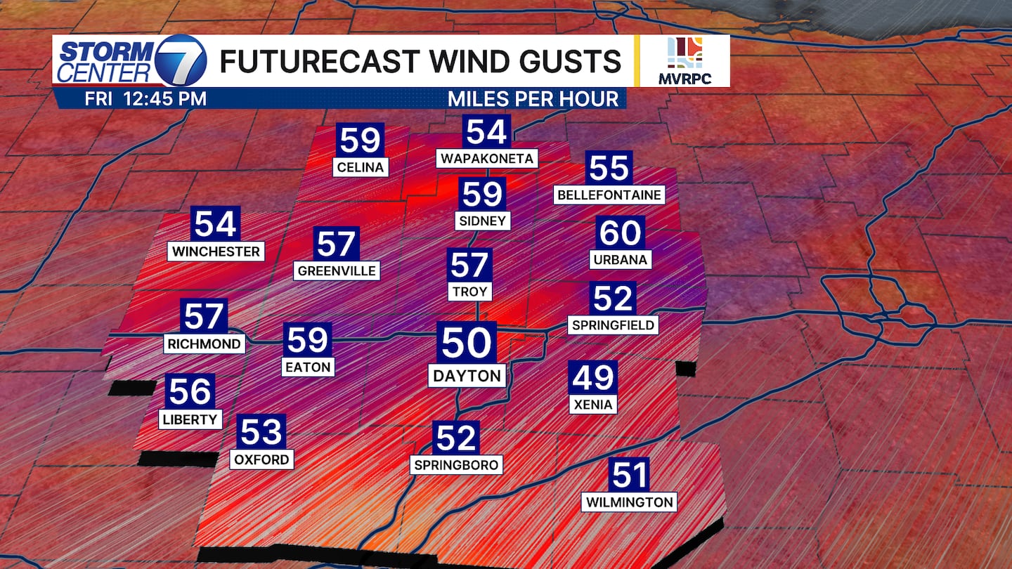 A High Wind Watch is in effect for Miami, Darke, Mercer, Auglaize, Shelby, Logan, Champaign Counties from 5AM to 8PM Friday. Some gusts to 60 miles per hour are possible in this area. An upgrade to a High Wind Warning is possible.