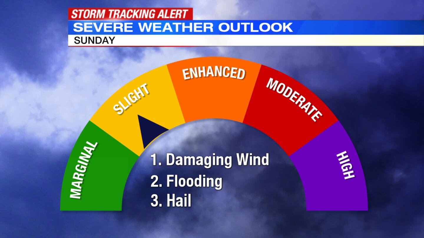 - Strong/severe storms possible with gusty winds Sunday