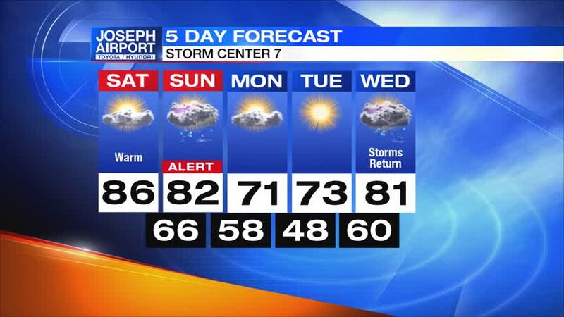Sunday: Another cold front will bring the chance for rain back. Highs will be in the low 80s as scattered showers and storms return through the day. Winds will be gusty. A strong storm or two could develop with damaging winds and hail as the main threats. Localized heavy rain again could cause issues. Outside of the storms, winds could gust between 40 and 50 mph. Showers and storms will end through the night.