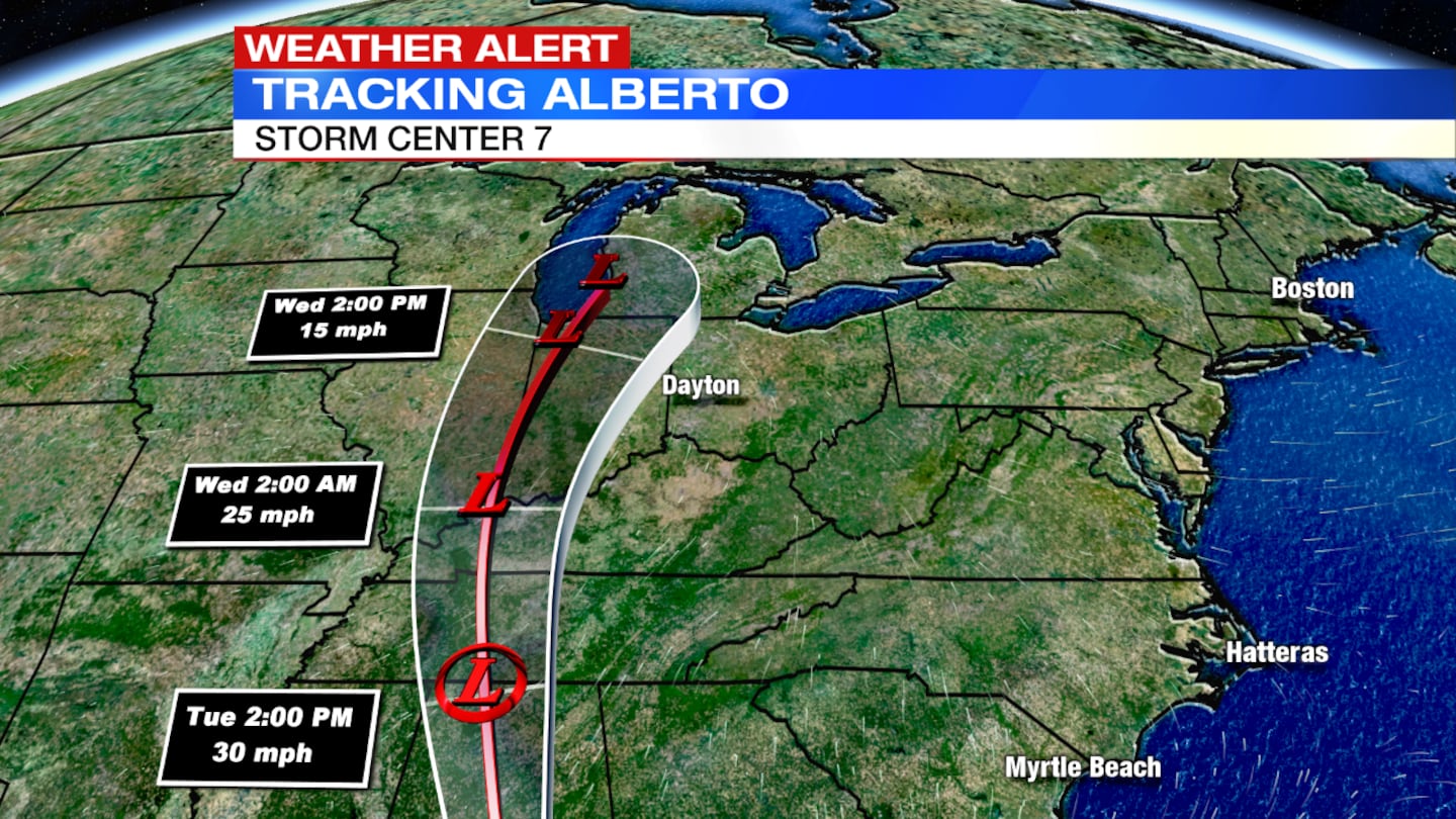 Wednesday: Scattered showers and storms for the day. Remnant of Alberto that move nearby will bring gusty winds and heavy rain at times. A mostly cloudy day with cooler temperatures in the lower 80s.