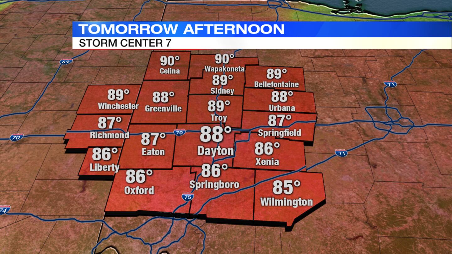 TUESDAY: A mild, but dry morning. Clouds increase through the afternoon with highs in the upper 80s. A very muggy day with heat index values reaching the low to mid-90s again. A few showers are possible at night.