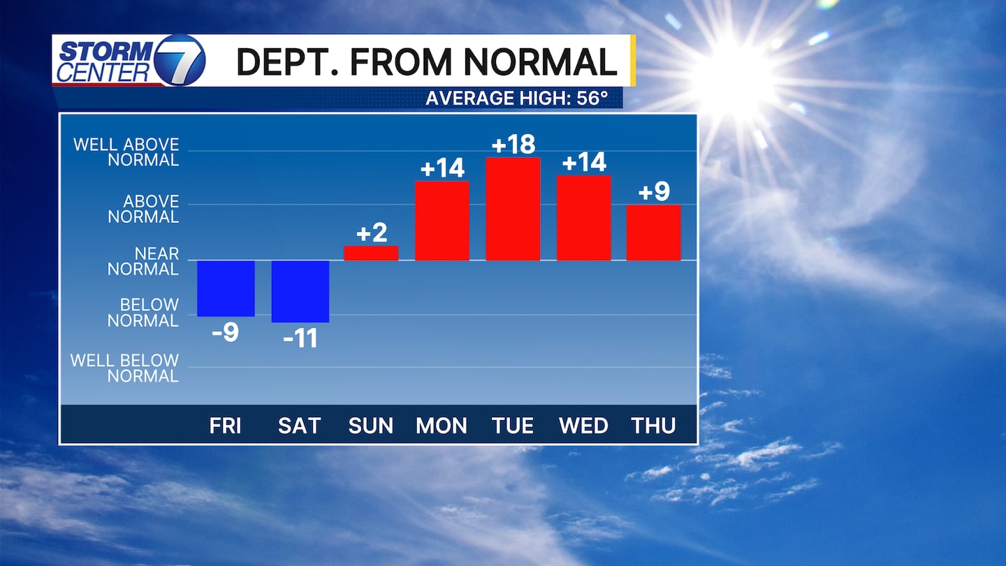 It’s another case of weather whiplash. Temperatures at 6 p.m. on Thursday evening were in the low 80s, but Friday morning at 6 a.m. were down in the upper 30s! The cold will be slightly worse before it gets better. Saturday morning will start with temperatures in the 20s with highs below average in the 40s. Sunday will start the warming trend.