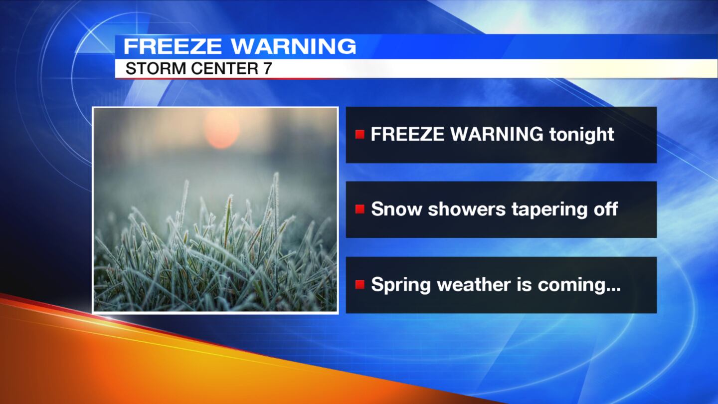 TONIGHT: While some flurries are still possible, steadier snow showers have ended for most areas. A Freeze Warning is in effect tonight for areas along and south of I-70. It will be cold with temperatures falling to around 30 degrees by morning