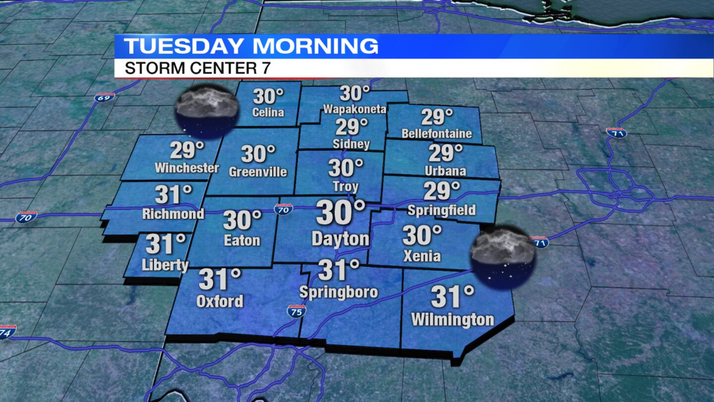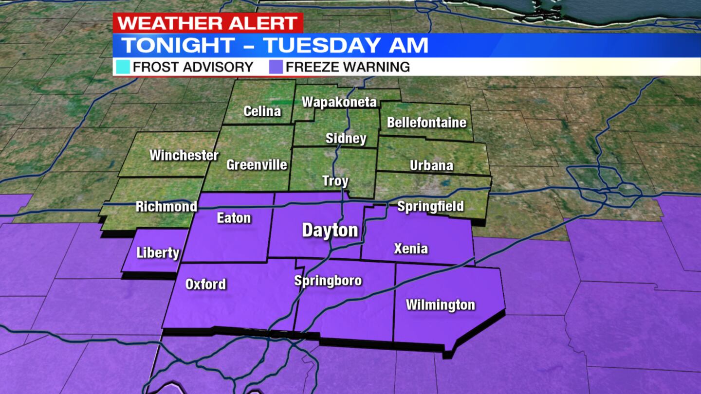 A Freeze Warning will last until 10 a.m. Tuesday for the following counties: Preble, Montgomery, Greene, Butler, Warren, and Clinton.