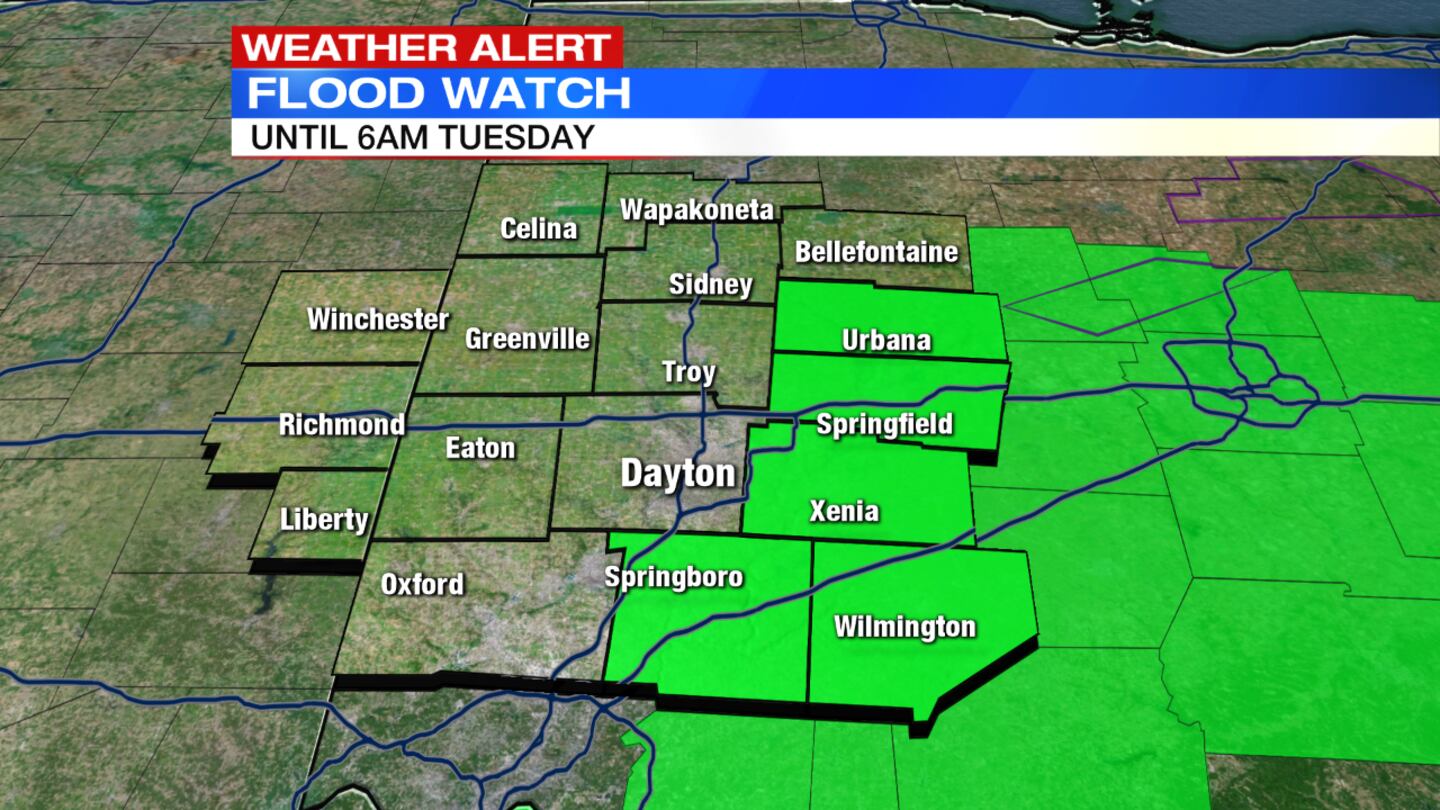 - Flash Flood Watch for Champaign, Clark, Clinton, Greene and Warren continues until 6 a.m. Tuesday