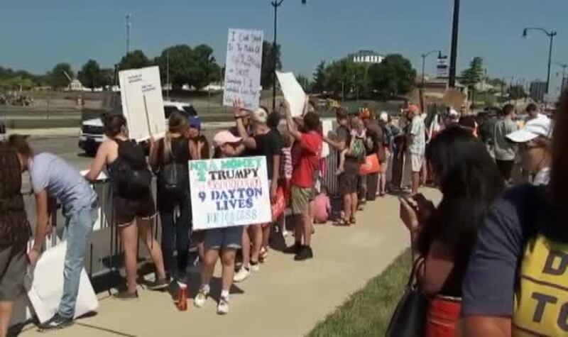 A large group of protesters has set up near Miami Valley Hospital ahead of a rumored visit from President Donald Trump.