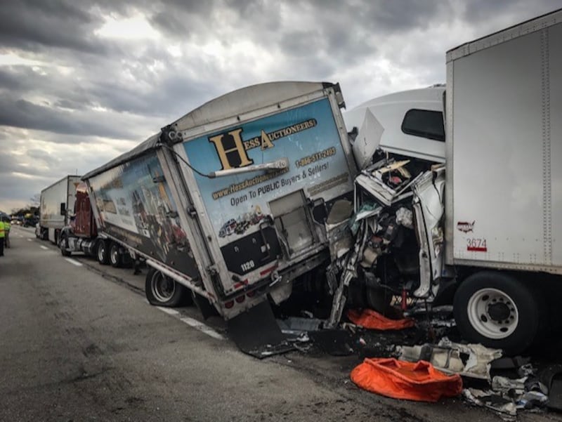 A driver in one of the semis, extricated from the wreckage and taken to Kettering Medical Center by helicopter, died at the hospital.