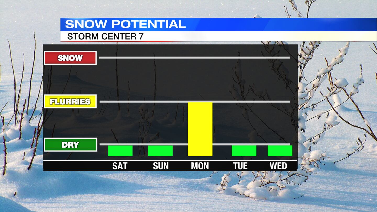 MONDAY: Scattered clouds. Cold again in the middle 20s. A weather disturbance may produce a few snow showers Monday afternoon. While precipitation looks light at this point, any snow that falls will stick with the cold temperatures.
