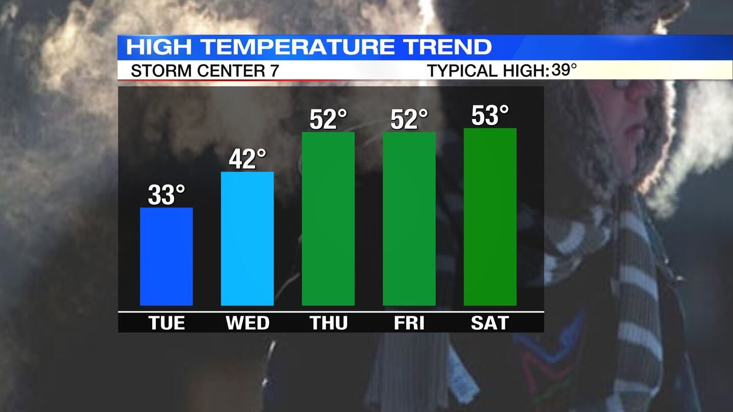 THURSDAY: A big warm-up expected for Thursday with highs pushing to the lower 50s. Clouds increase and breezy during the day. Chance of a few showers at night.