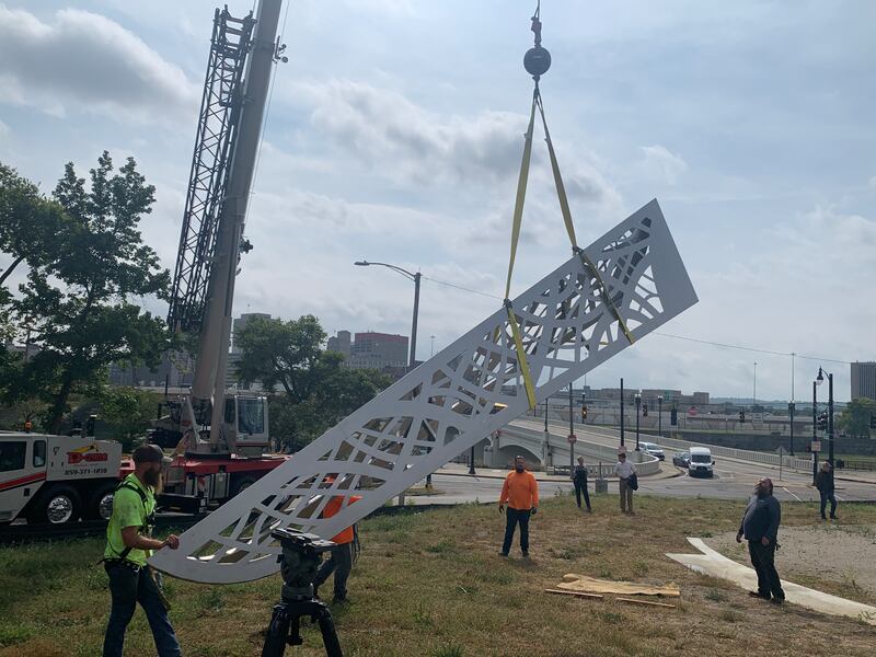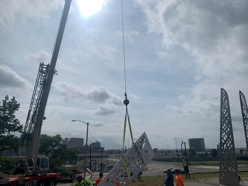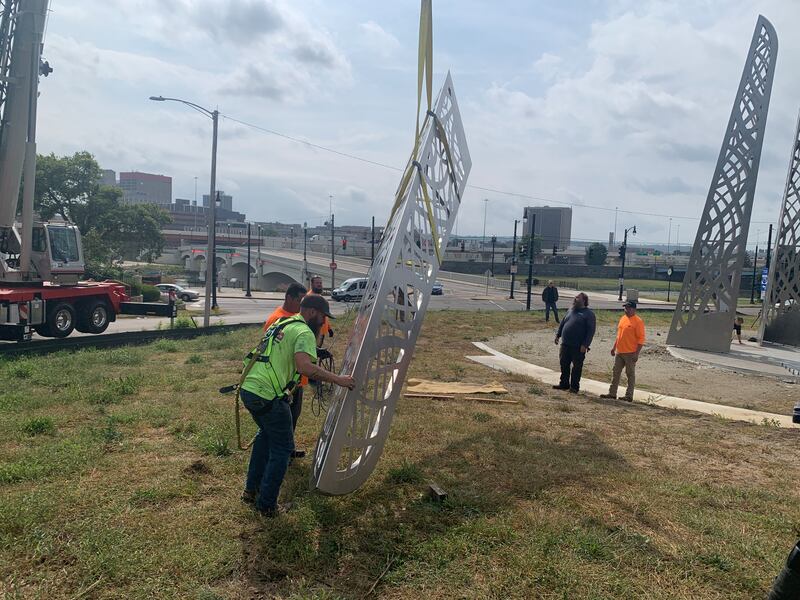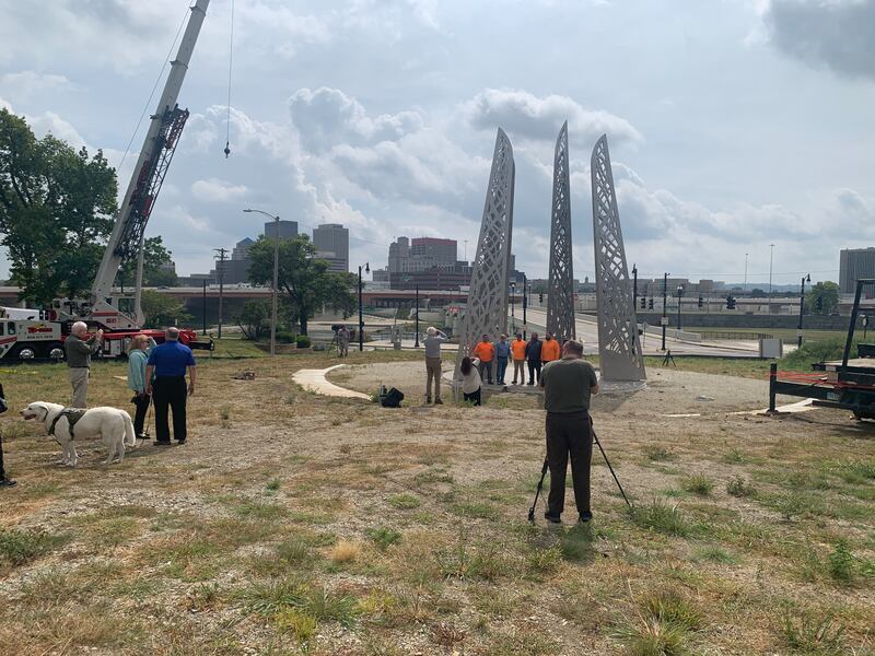 Construction crews have begun installing the first visible elements of the memorial, which faces the river and downtown. Five steel spires were recently bolted down, designed to resemble an eagle’s wings, symbolizing uplift and support.
