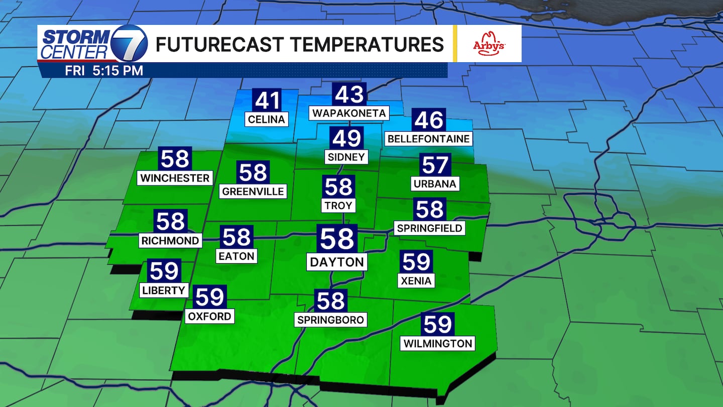 A bit of a complex forecast in store for Friday morning. There is a very low chance of freezing rain around Wapakoneta and Bellefontaine where temperatures could be around 32 early on. We will all find temperatures rising, but check out how the afternoon looks below and you will see how the forecast is tricky!