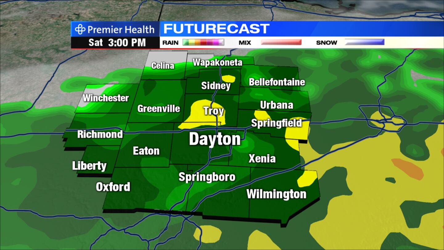Saturday: Cloudy with on and off rain that may become heavy at times, especially south. Breezy with some winds gusting as high as 25 mph at times. Rainfall accumulations between ½-inch to 1½-inch are possible. Higher amounts may lead to minor flooding in spots. Highs for the day will reach into the upper 40s.