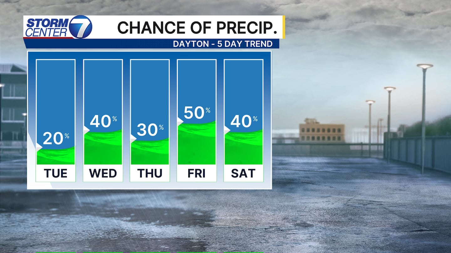 The front will stall over us which means there are chances for rain and storms heading through this week and into this weekend. No day will be a washout but showers and storms may be over parts of the Miami Valley, even into Easter Sunday.