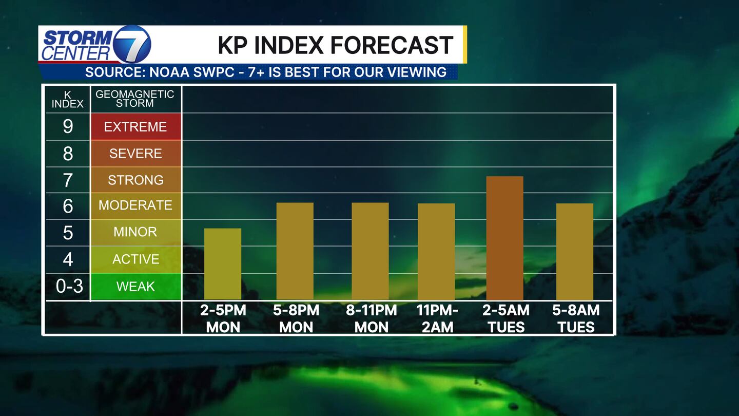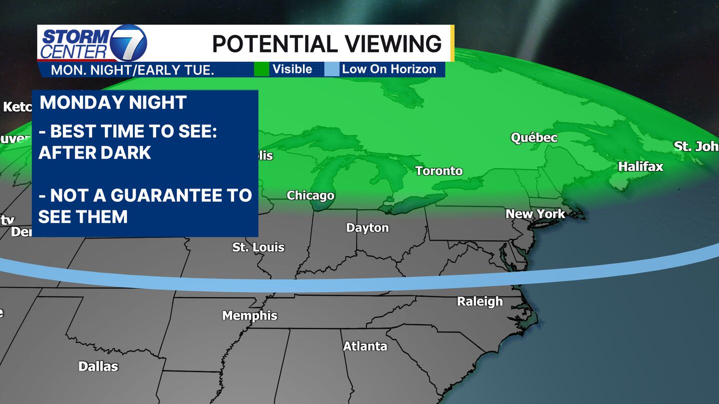 The current window for viewing would be after dark Monday night through the pre-dawn hours on Tuesday morning. It would not be a constant, all-night display. So, some patience is required!