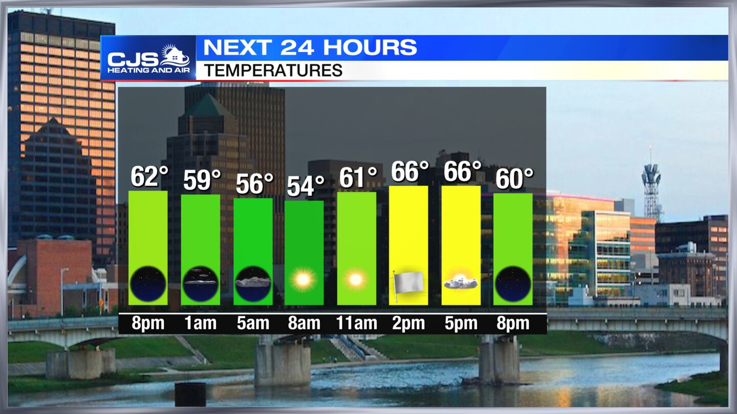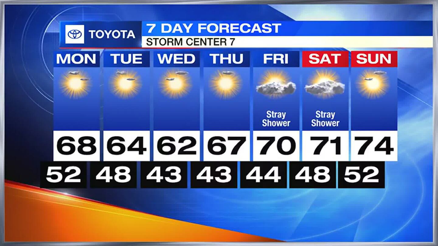 MONDAY: Cooling again Monday with a few clouds around in the early morning, then clear. Highs expected in the upper 60s.