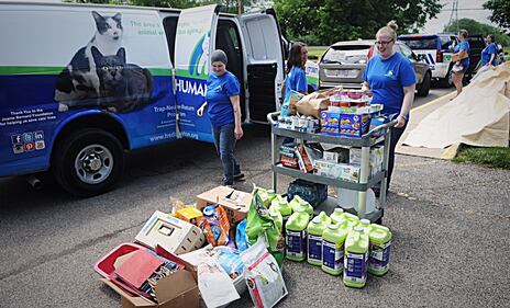 PHOTOS: Tornado-damaged communities dig out, clean up The Humane Society of Dayton load vehicles Friday with donated pet supplies and are heading to storm damage areas