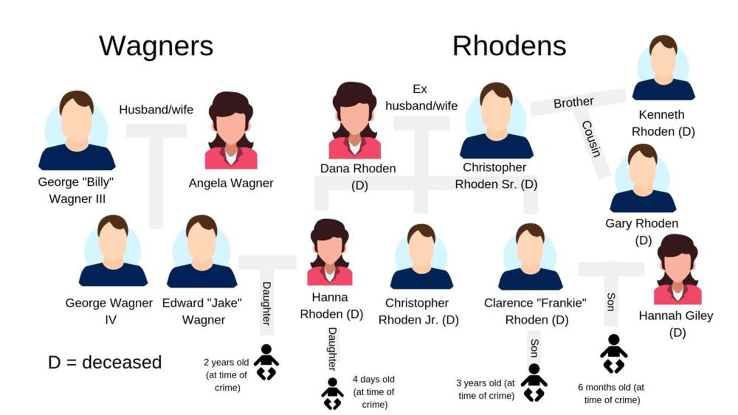 George Wagner IV was previously indicted on multiple counts of aggravated murder, as well as other charges. He’s been accused of killing Hannah Rhoden, 19; her father Christopher Rhoden Sr., 40; his wife, Dana Rhoden, 37; their sons, Christopher Rhoden Jr., 16, and Clarence “Frankie” Rhoden, 20; Frankie’s fiancé, Hannah Gilley, 20; and relatives Kenneth Rhoden, 44, and Gary Rhoden, 38, in April 2016.