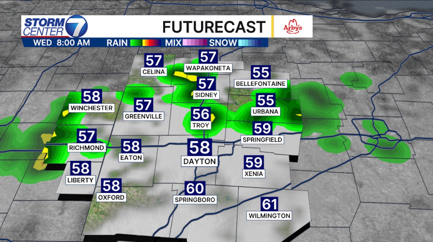 DAYTON — A weak cold front begins to push south from the Great Lakes, but doesn’t make it through the Valley. It does however bring scattered rain and a few rumbles of thunder throughout the morning and even a few scattered storms can redevelop throughout the evening. No severe weather is forecast, but a quarter of an inch or rain is possible through Thursday.