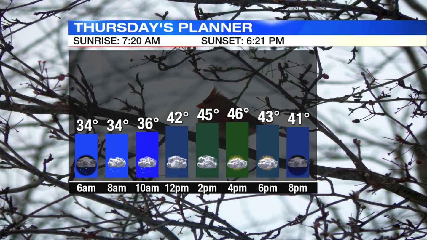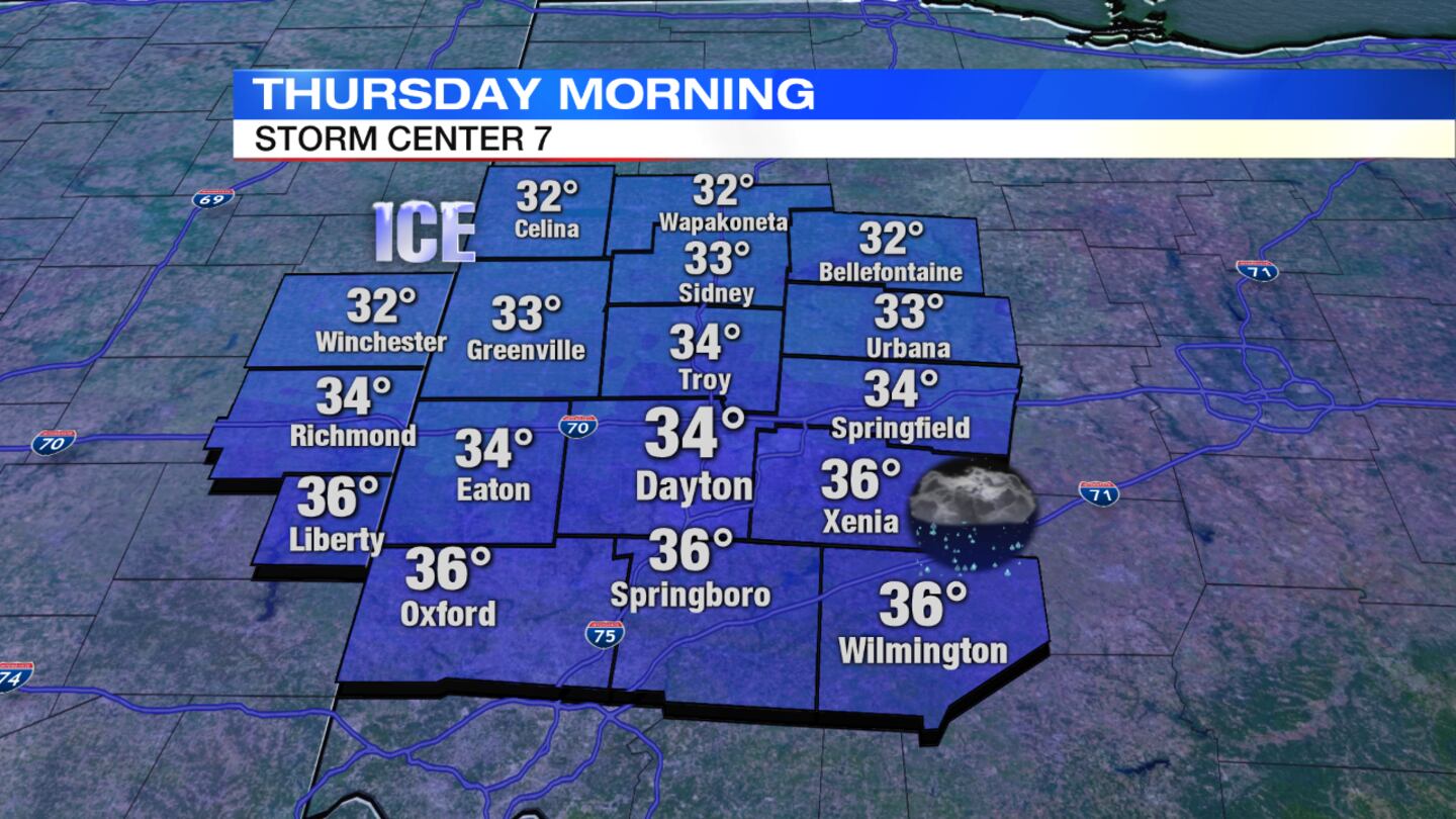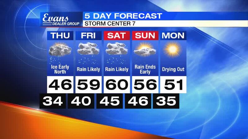 THURSDAY: Rain or freezing rain in the morning then drying out. Clouds will remain. Temperatures will hold in the middle 40s.